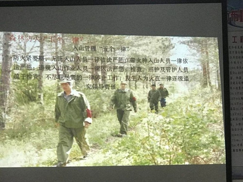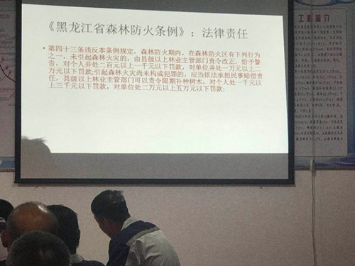 随后,防火办预防员王宇飞以警示案例和实际工作相结合的方式,从四个方面进行讲解,并重点对《黑龙江省森林防火条例》和“入山管理五个一律”及“吸烟弄火五个一律”进行解读。