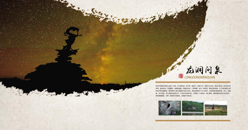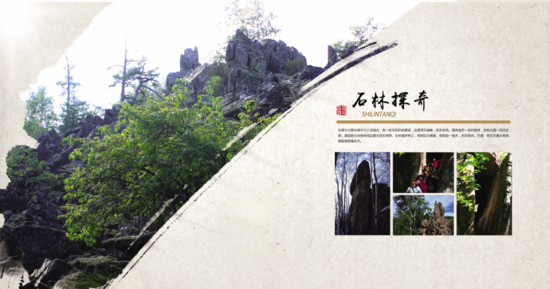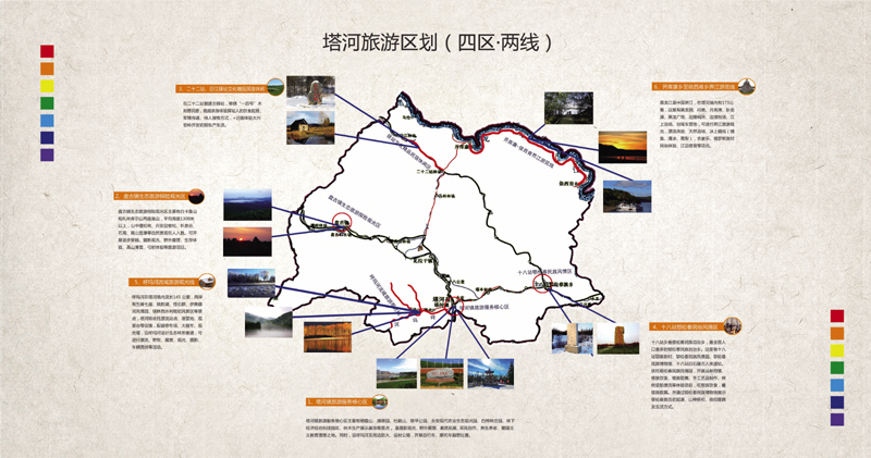 1.回归原始,探秘鄂伦春:“鄂乡秘踪”2.踏古驿站看历史文化,吹新风终换新颜面;“古驿新风”3.黑龙洞中寻黑龙,问泉脚下待问泉:“龙洞问泉”4.黑龙卧处江抱月,秋色到时眼迷离:“江湾秋色”5.扎林库尔景满山,高山望雪显奇观:“高山望雪”6.铁甲雄魂戍边关,冰河誉载爱国园:“铁甲冰河”7.五月杜鹃林中笑,一朵两朵花枝俏:“杜鹃映日”8.日落栖霞彩流溢,余晖映处别样红:“栖霞余晖”9.巨崖百丈平地起,四季景胜意更浓:“巨崖揽胜”10.奇石天凿无修容,探险猎奇唯此中:“石林探奇”