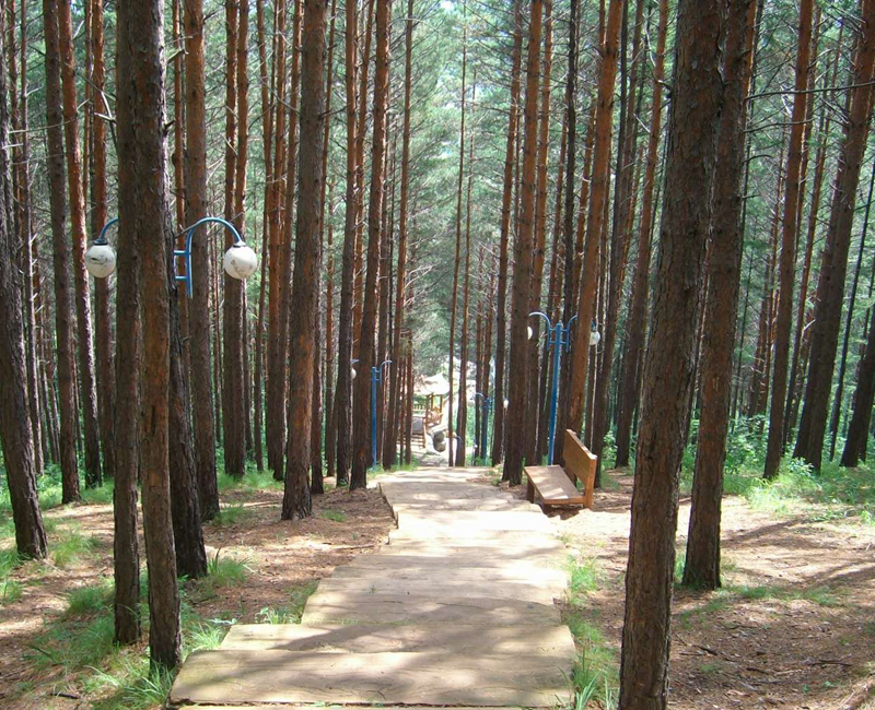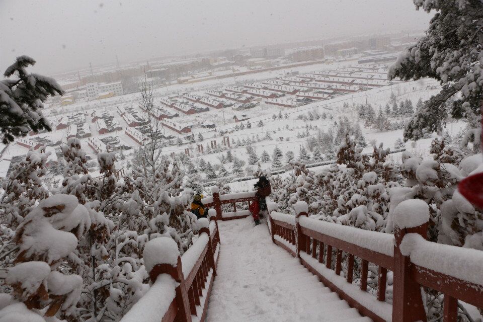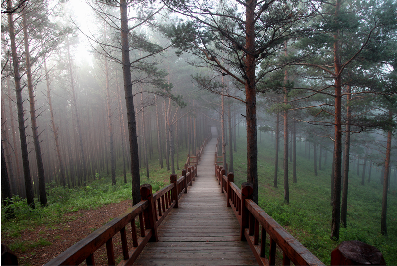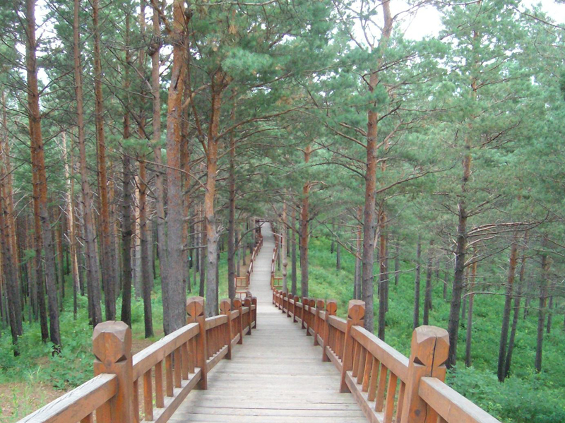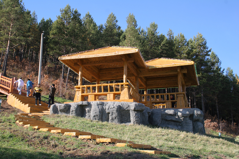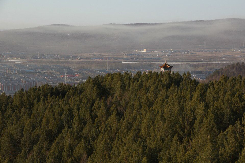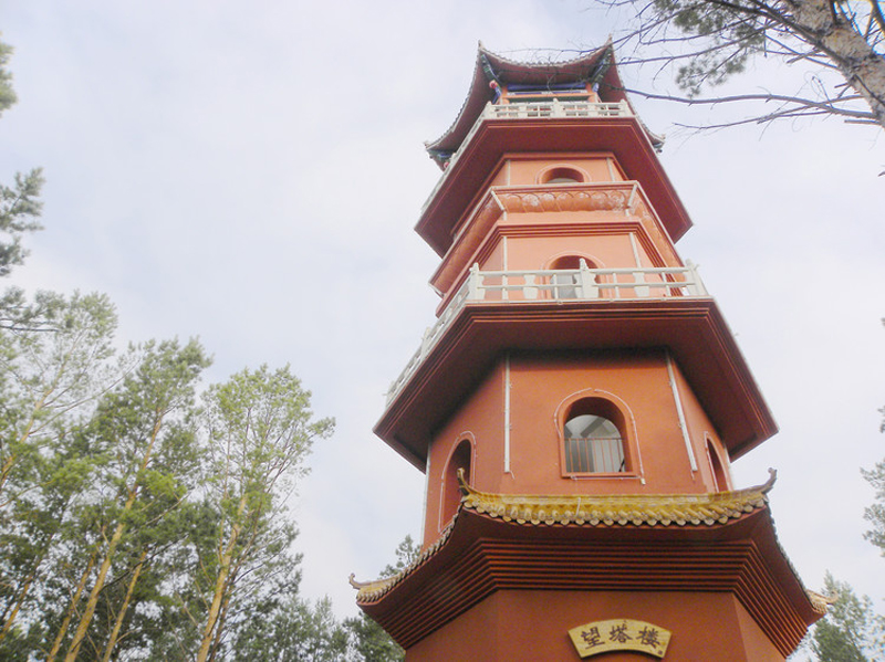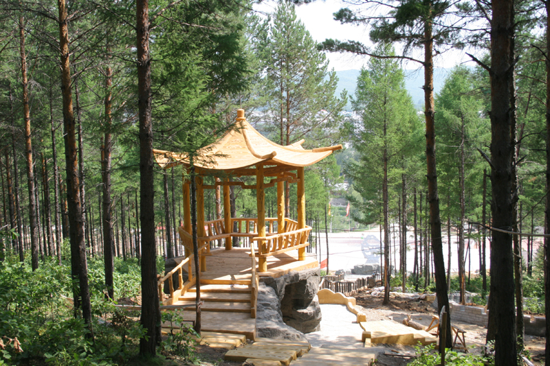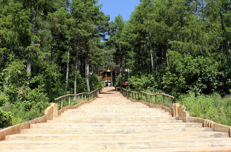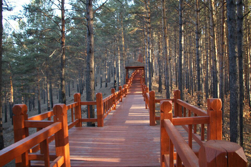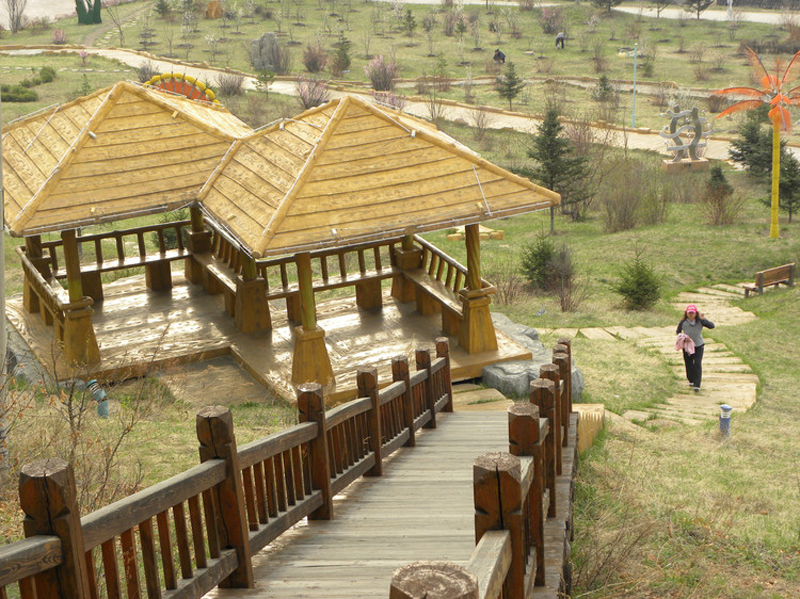 南侧山脚下有一蘑菇形凉亭,从凉亭出发,有一座淡黄色护栏的木桥延伸到林海中,直达山顶。这一条栈桥长440米,耗用木材500立方米。在半山腰林海深处有一座砖木质凉亭—松涛阁。沿着越来越陡的台阶,登上山顶,和南侧上山的木桥相汇,是一座29米高的望城亭。