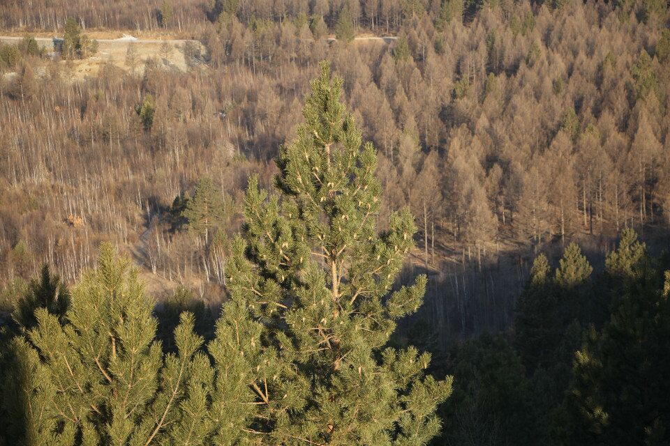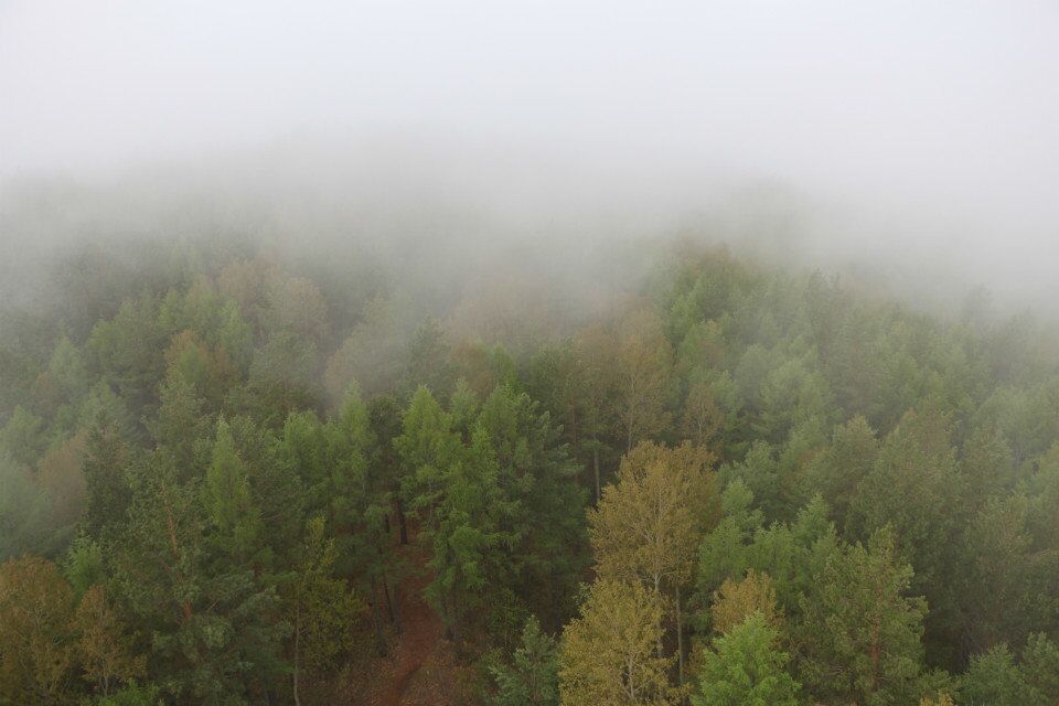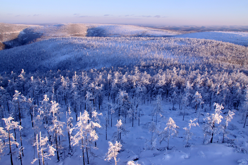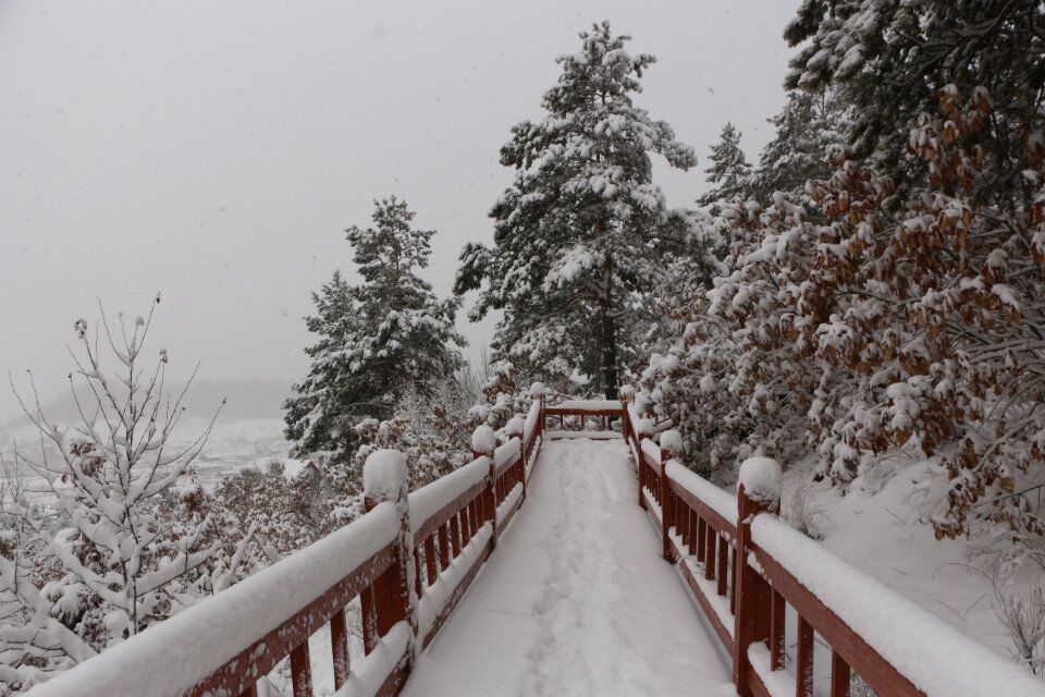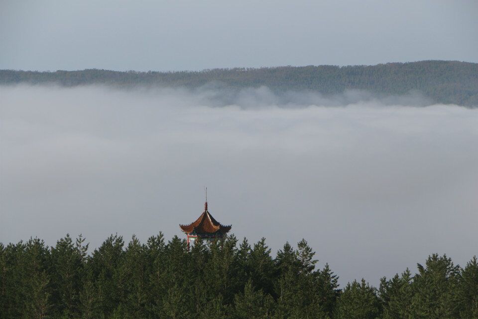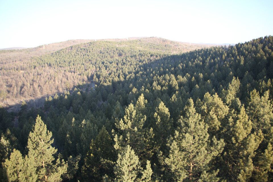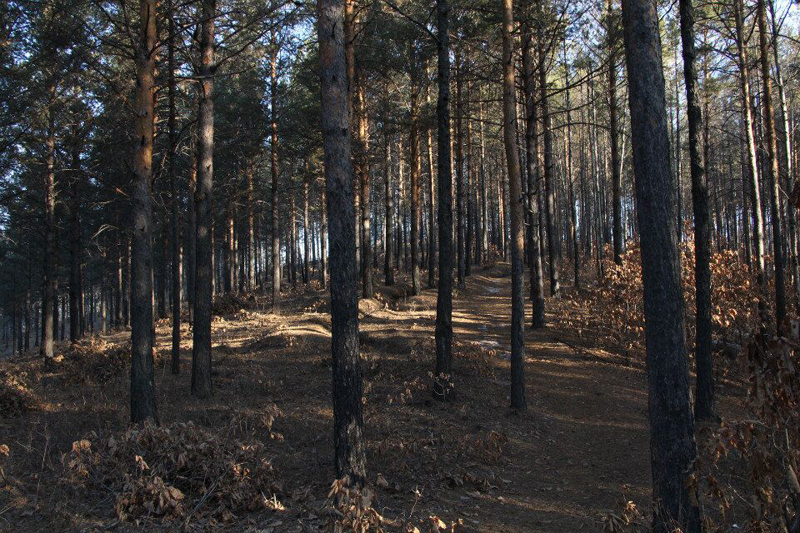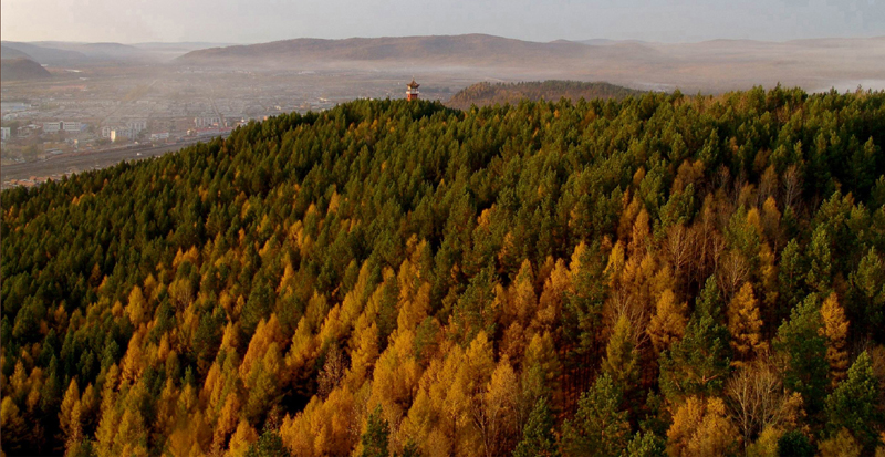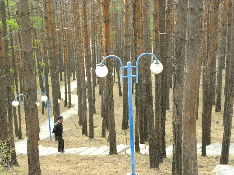 南侧山脚下有一蘑菇形凉亭,从凉亭出发,有一座淡黄色护栏的木桥延伸到林海中,直达山顶。这一条栈桥长440米,耗用木材500立方米。在半山腰林海深处有一座砖木质凉亭—松涛阁。沿着越来越陡的台阶,登上山顶,和南侧上山的木桥相汇,是一座29米高的望城亭。