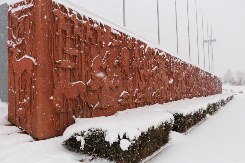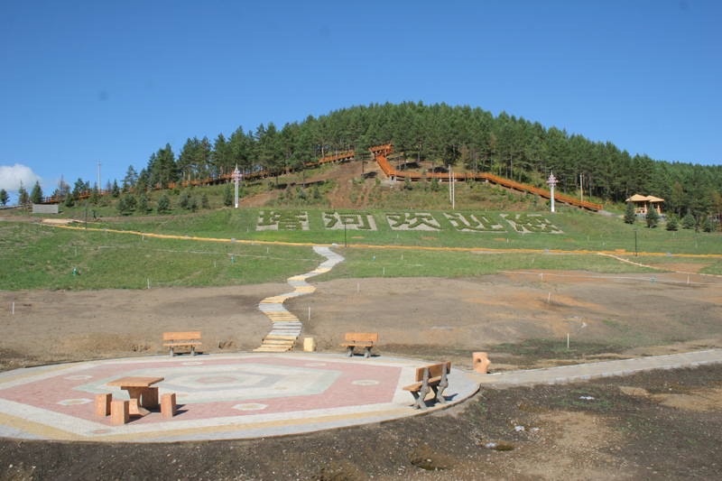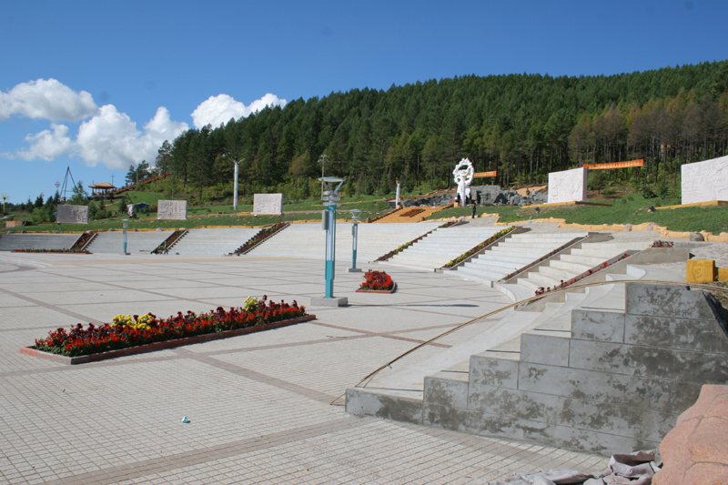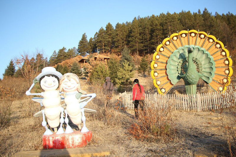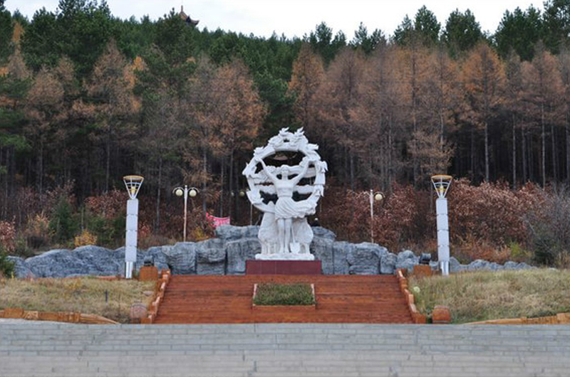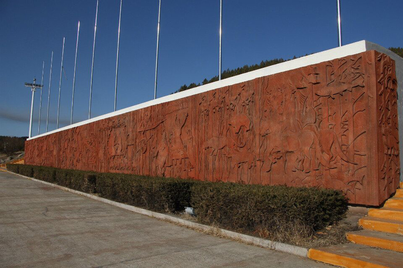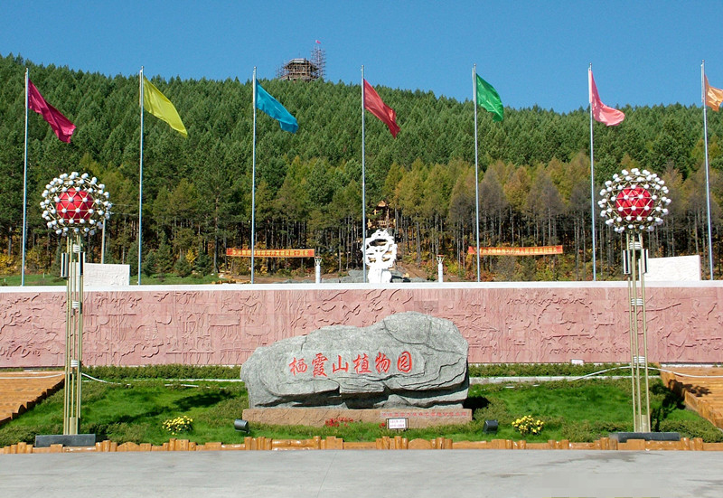 走进植物园,在入口处就会看见一块巨石上写有“栖霞山植物园”六个红色大字。巨石周围是草坪,夏天来临,娇嫩的草坪上装点着一簇簇的鲜花。巨石的左右分别是仿木踏步台阶和随着台阶倾斜的草坪。巨石的后面是巨幅的红沙石壁画墙,近观,可看见春巡秋防、昔日游猎、山果采集、男亲女爱、萨满请神、神话英雄等画面,台阶上古老鄂伦春民园内还设有花岗岩浮雕六幅,分别以华夏乐土、挺进林海、黄金时节、消除火魔、生态林业、和谐社会为主题。我们不禁会为工匠们的才华所折服。