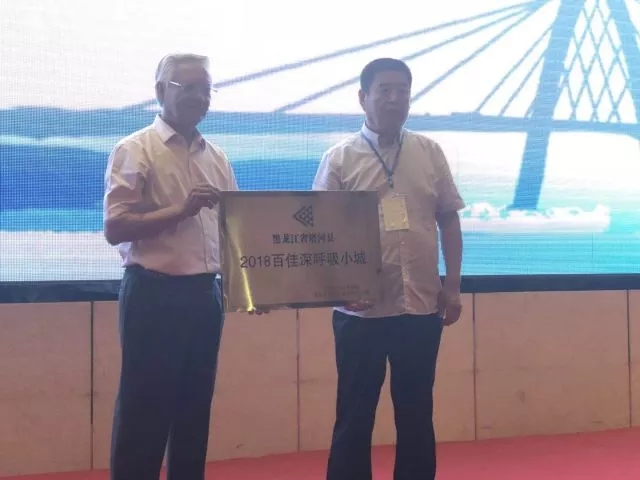 学会顾问、原地质矿产部副部长、十届全国政协环资委员副主任陈洲其分别为黑龙江塔河县、黑龙江绥棱林业局、黑龙江红兴隆农垦局等21个深呼吸小城授予“2018百佳深呼吸小城”奖牌。