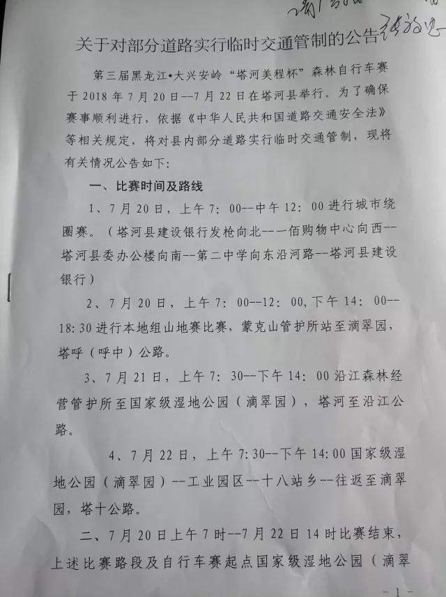 第三届黑龙江?大兴安岭“塔河美程杯”森林自行车赛于2018年7月20日--7月22日在塔河县举行。为了确保赛事顺利进行,依据《中华人民共和国道路交通安全法》等相关规定,将对县内部分道路实行临时交通管制,现将有关情况公告如下: