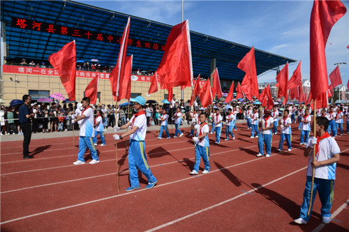 2018年07月05日上午,塔河县第30届中小学生田径运动会在县体育场隆重举行。塔河一小积极参与,亮点频出。一是仪仗队整齐,是唯一继续保持既有号队、腰鼓队方阵的学校。二是大型团体操表演从队形上体现“一小”字样、从颜色上体现“中国风”、从主题上体现“童心鼓韵”,对中华优秀传统文化既传承又创新。三是无论是跳远还是拔河亦或是跑赛,各个田径项目都体现友谊第一比赛第二。